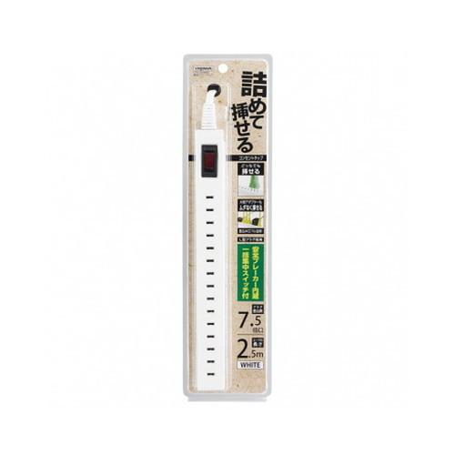 【商品特長】業界初の詰めて挿せるコンセントタップ●業界初の詰めて挿せるコンセントタップ●ひとつずつ差込み穴をズラして挿せます。●プラグ・アダプターを自分仕様に思いのままスッキリ挿せます。●壁にピッタリ!邪魔にならないL型プラグ採用●大型アダプターもスペースを無駄にすることなく挿す事ができます。●さまざまなコンセントプラグ形状に対応できます。●一度にON/OFFで待機電力カットできます●電力オーバー時、電気を遮断し火災を予防します。【仕様】●カラー:ホワイト●定格容量:125V 15A 合計1500Wまで●個口数:7.5個口●コード長(m):2.5m●パッケージサイズ(mm):約95×355×60●本体寸法(mm):約29×262×28●本体重量(g):350g