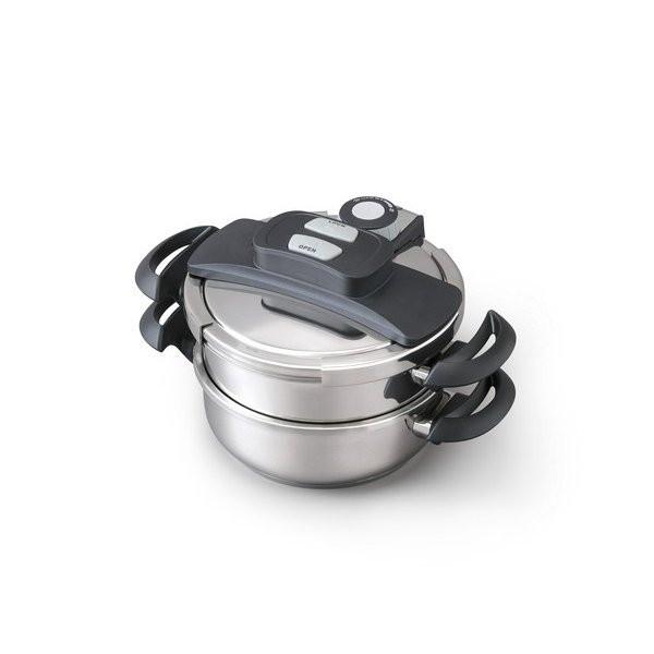 料理に応じて低圧・高圧の切り替えが簡単にできるダイアル式の両手圧力鍋3L・5Lのセットです。圧力の状態が一目でわかる圧力表示付きです。ふたはボタンを押すだけのワンタッチ開閉です。圧力調整装置で余分な蒸気を排出し、圧力を一定に保ちます。圧力がかかっているときはロックピンが上がり、ふたをロックします。また、鍋の圧力が完全に下がらないとふたが開かない安全設計です。鍋を2つ重ねて収納できます。