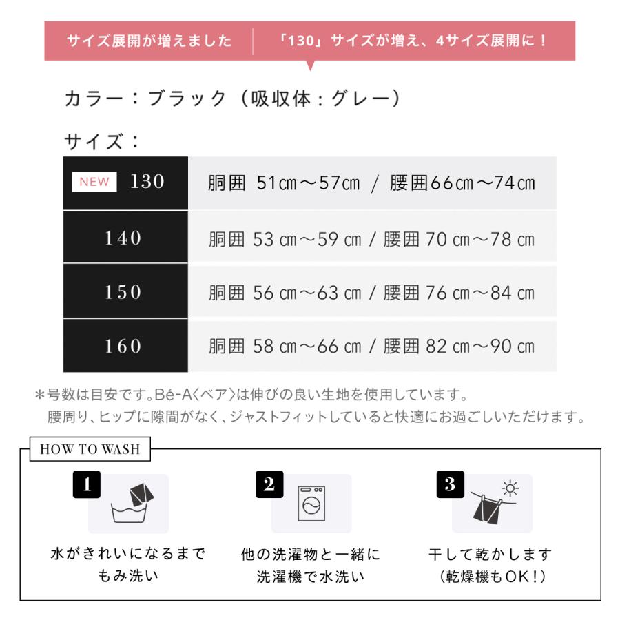 【サイズ】130:胴囲51cm〜57cm、腰囲66cm〜74cm140:胴囲53cm〜59cm、腰囲70cm〜78cm150:胴囲56cm〜63cm、腰囲76cm〜84cm160:胴囲58cm〜66cm、腰囲82cm〜90cm※Be-A〈ベア〉は伸びの良い生地を使用しています。腰周り、太もも周りに隙間がなく、ジャストフィットしていると快適にお過ごしいただけます。【カラー】ブラック(吸収体:グレー)※ご利用のモニター環境により色合いが異なって見える場合がございます。【素材】[本体] ポリエステル100%[クロッチ] ポリエステル100%[吸水層] ポリエステル100%[抱水層] キュプラ56%、アクリル22%、レーヨン22%[防水層] ポリエステル100%【製造国】ベトナム【使用上のご注意】新しい生地は液体を弾きやすいため、漏れを防ぐためにもご使用前に一度洗濯機での予洗いをしてください。少の洗剤でショーツ単体を洗い自然乾燥ののちお使いいただけます。使い心地に慣れていただくためにも、最初はご自宅にいる時間が長い日や量の少ない日から徐々にお試しください。"}