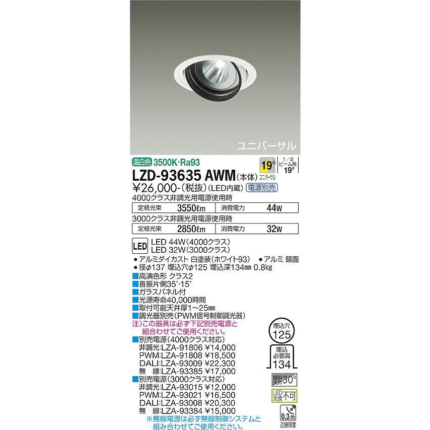 DAIKO 大光電機 LEDユニバーサルダウンライト(電源別売) LZD-93635AWM