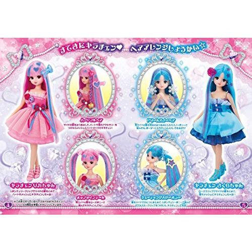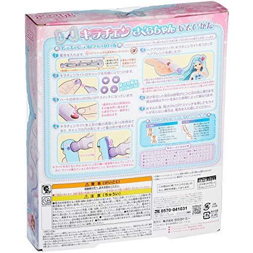 ライトでキラッと色が変わるよ!キラチェンさくらちゃん♪ 付属のキラチェンライトの光をさくらちゃんの髪の毛にあてると、水色の髪の毛がパープルにカラチェンします。 ライトの先端に付属のキャップをつけるとハートや星などの形にカラチェンでき、ステンシルのような遊びが楽しめます。 キャップは全部で4種類。 ヘアクセサリーやヘアアレンジBOOK付きで、キラチェン遊びが広がります。 [セット内容]キラチェンさく ..."}