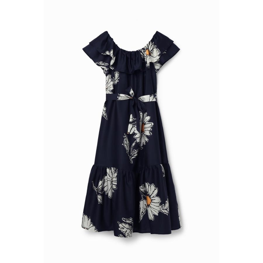 上部にフリルをあしらった、オフショルダーシルエットの半袖ミディワンピース。マーガレットプリントデザインで、ベルトが付いています。