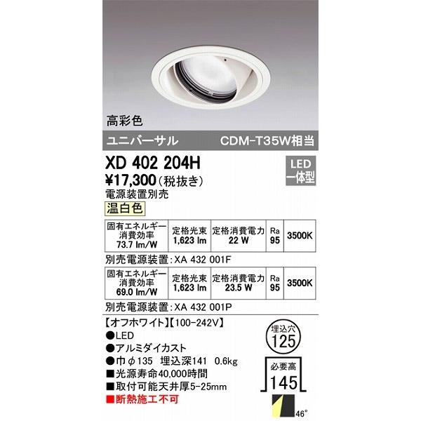 オーデリック XD402204H ユニバーサルダウンライト LED(温白色)