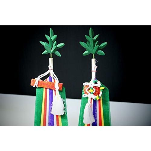 国産、手作りの美しい「真榊」。小型の神棚に合う、高さ24cmサイズとなります。神棚周りの神具としてはとても人気のある装飾品です。真榊は神様の領域をあらわす神具、また神事の場では祭壇の左右に立てられる祭具としても有名です。 榊の葉の部分には生絹を使用しております。三種の神器である、鏡、勾玉、剣が小さいながらも精巧に再現されています。神宝を象り浄明・智徳・勇気をお祈りすることができます。"}
