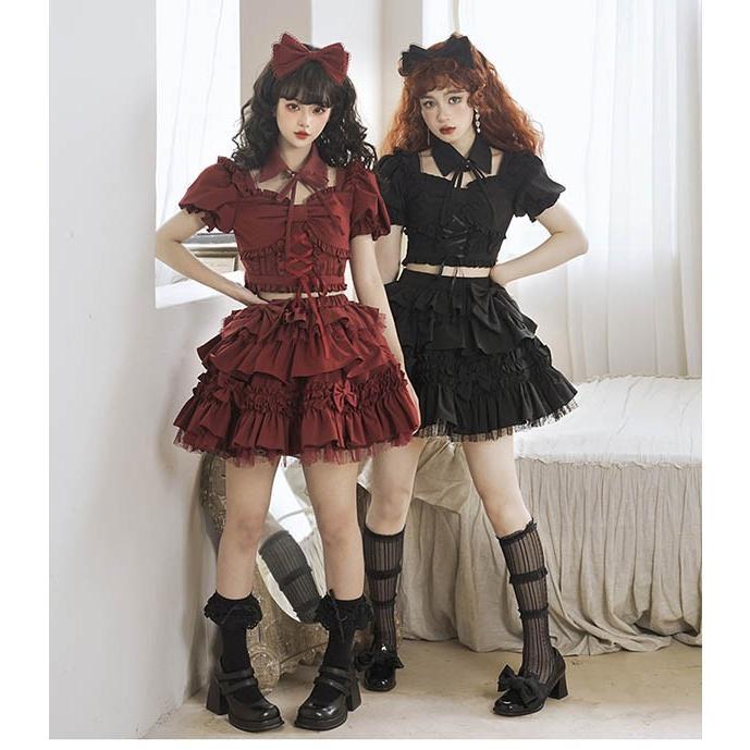 [ セット内容 ]トップス/スカート/付け襟オプション「赤カチューシャ」:1980円オプション「黒カチューシャ」:1980円「記載のないアクセサリー、小物等は付属しません」[ カラー ]ブラック/ワインレッド[ 素材 ]ポリエステル[ サイズ ](cm)S/M/L※ご注意:詳しいサイズや注意点については、【商品情報・詳細】を必ずご確認ください。[ 送料 ]1点 550円2点目から1点毎に 500 円加算(九州・沖縄・北海道・離島は除く)ステージ衣装 アイドル服 ロリータ 上下セット コスプレ衣装 ショートトップス ティアードスカート コスチューム リボン レースアップ ゴシックロリィタ ゴスロリ 半袖 袖付き フリル裾 クリスマス レディース 仮装 学園祭 文化祭 イベント dd109x1x1x1