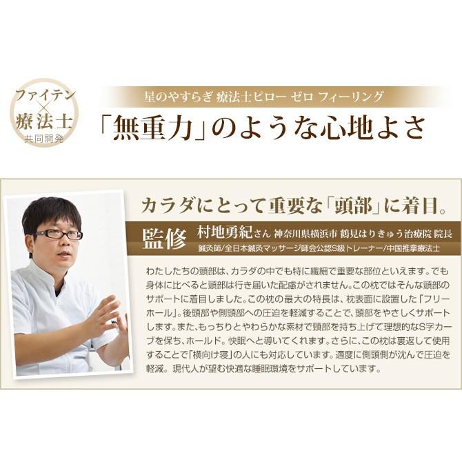 ファイテンと療法士の共同開発! よりよい眠りのために、ファイテンと療法士が共同開発した枕です。素材にはもっちりとした、驚きの柔らかさを誇る高級低反発素材を採用し、アクアゴールドシリカを配合。枕中央に開いたフリーホールが後頭部や側頭部の負担を軽減し、また周囲の立体形状が頸部を持ち上げて、理想的な寝姿勢へと導きます。頭を載せるだけで、まるで無重力のような心地よさで快眠・安眠をサポートします。■内容量・サイズ⇒【ゼロ フィーリング85】幅 約56cm×奥行 約36cm×厚さ 約8.5cm/【ゼロ フィーリング105】幅 約56cm×奥行 約36cm×厚さ 約10.5cm■成分・素材⇒生地:綿50%、ポリエステル50%/中材:ウレタンフォーム/技術:アクアゴールド、アクアゴールドシリカ■備考⇒※カバーは取り外しできません。MADE IN JAPAN"}