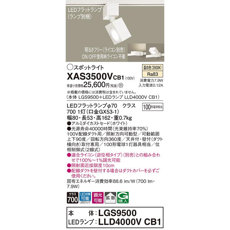 【同一ストア内で税別15000円以上ご購入で送料無料(沖縄・離島など一部地域は除く) 】 住宅用照明器具 パナソニック スポットライト XAS3500VCB1 検索用カテゴリ8 【LED照明】 【プラグタイプ】 【温白色】 【拡散タイプ】 【調光可】ランプ別梱包