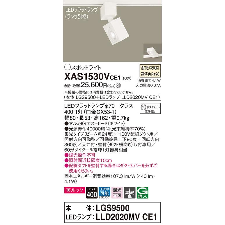 【同一ストア内で税別15000円以上ご購入で送料無料(沖縄・離島など一部地域は除く) 】 住宅用照明器具 パナソニック スポットライト XAS1530VCE1 検索用カテゴリ8 【LED照明】 【プラグタイプ】 【美ルック】 【温白色】 【集光タイプ】 【非調光】ランプ別梱包