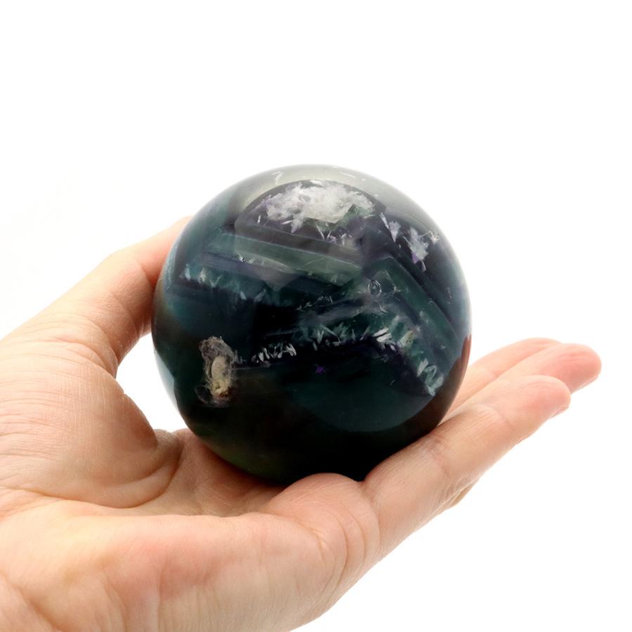 ■サイズ直径 約66mm(±5mm) 重量513g■備考天然の傷、クラックなどがある場合がございます。※一部、アクリル樹脂で補修した跡がある場合がございます。台座が付属します。■エンジェルフェザーフローライトとはエンジェルフェザーフローライトは流通量が少なく、希少な石です。和名を石花蛍石と言い、パッと咲いた白い花のような美しいインクルージョンが特徴的。ふわふわとした天使の羽が重なり合ったような白いインクルージョンがはっきりとご覧いただけます。鮮やかなグリーンにパープルの帯が絶妙なバランスで折り合い、神秘的なとても美しい色合いです。クリスマス お返し プレゼント 贈り物