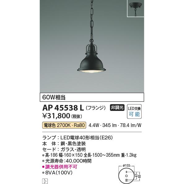 安心のメーカー保証【ご注文合計25,001円以上送料無料】T区分 コイズミ照明器具 AP45538L ペンダント LED 実績20年の老舗