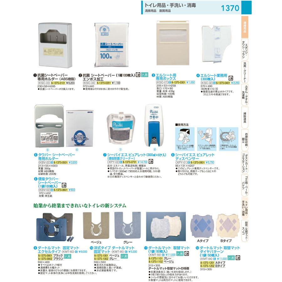 9-1424-0801 8-1370-0701 7-1336-0701成分:エタノール、界面活性剤、精製水●常設のトイレットペーパーが除菌シートに早がわり。●1パウチ(300ml)で約500人分使用可能、コスト節減、 労力軽減。※[XPY01]専用ディスペンサーと合わせて御使用ください。※入数