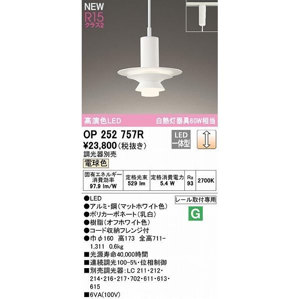 OP252757R オーデリック レール用ペンダントライト ホワイト LED 電球色 調光