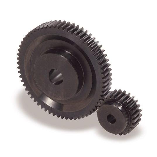 平歯車は平行な2軸に取り付けられ、一方の軸からもう一方の軸へ回転運動を伝えるために使用されますが、かみ合う歯車のうち歯数が多い歯車を大歯車(ギヤ)、小さい歯車を小歯車(ピニオン)と呼びます。