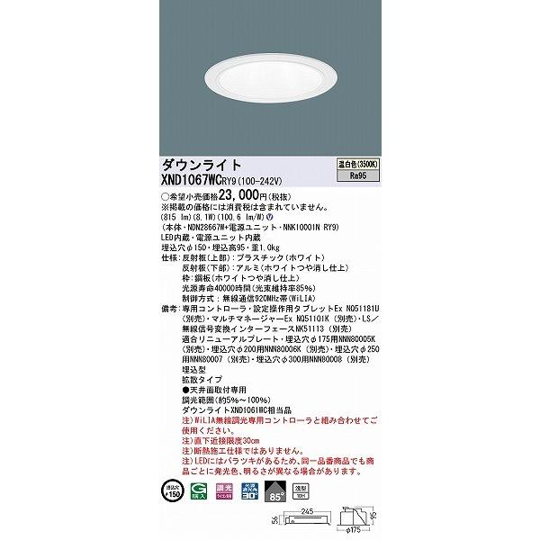 ■返品区分:「返品」お客様都合による返品・交換は受付いたしません。仕様等はご注文前に必ずご確認ください。■送料区分:「送料区分A」※画像はイメージです。商品の詳しい仕様はメーカー受付窓口/HPにてご確認ください。※掲載商品は予告無く販売終了となっている場合もあり、掲載商品全ての出荷確約をするものではありません。パナソニック XND1067WCRY9 XND1061WC 相当品 LED 温白色 WiLIA無線調光 NDN28667W + NNK10001NRY9 20220124 家具、インテリア 照明器具 天井照明、シーリングライト ダウンライト 照明器具 施設用照明器具 ダウンライト LED WiLIA無線調光XND1067WCRY9 商品説明