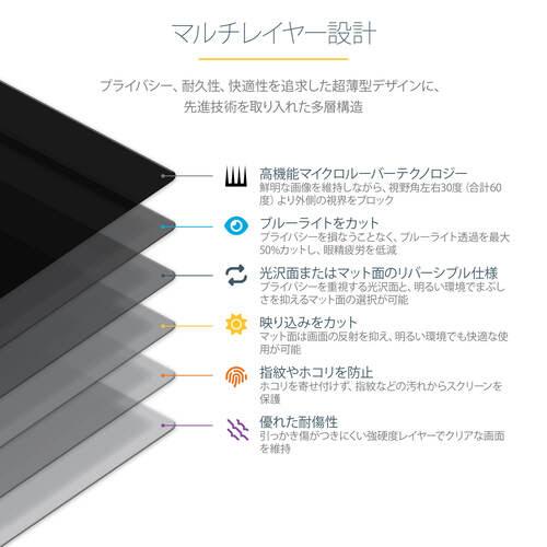 ●映り込みが気になる環境に適したアンチグレア(反射防止/無光沢)と、色の鮮やかさを保つことができるハイグロス(光沢仕上)の両面使用が可能。マット面は、傷や指紋がつきにくいコーティングで高い保護効果。