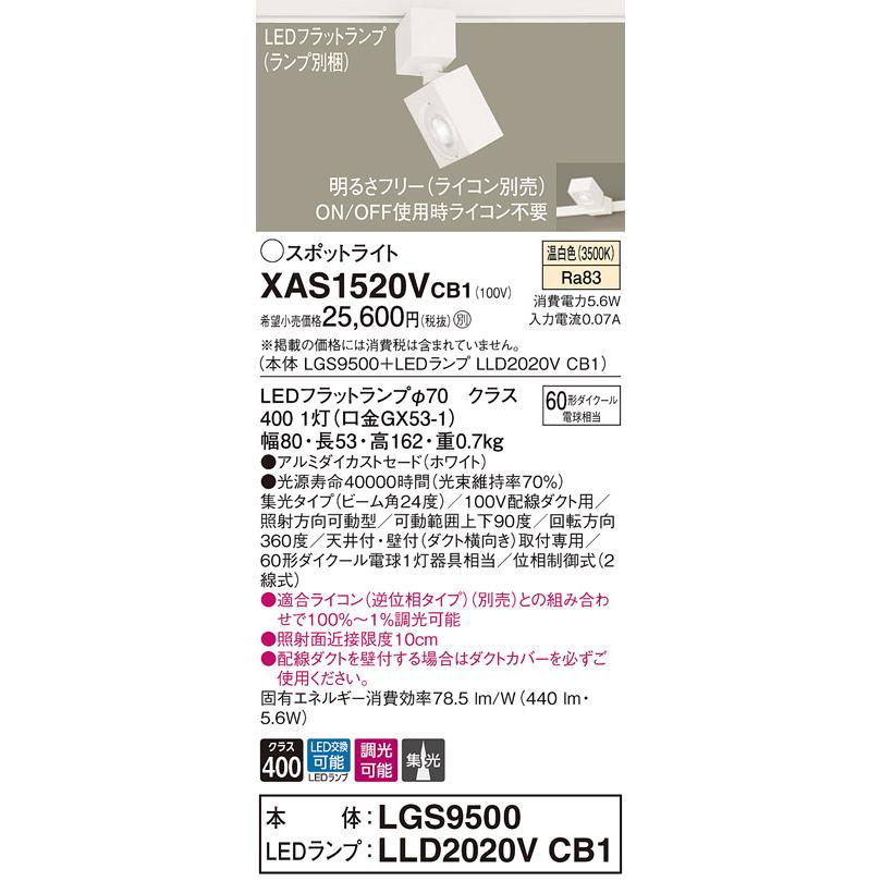 【同一ストア内で税別15000円以上ご購入で送料無料(沖縄・離島など一部地域は除く) 】 住宅用照明器具 パナソニック スポットライト XAS1520VCB1 検索用カテゴリ8 【LED照明】 【プラグタイプ】 【温白色】 【集光タイプ】 【調光可】ランプ別梱包