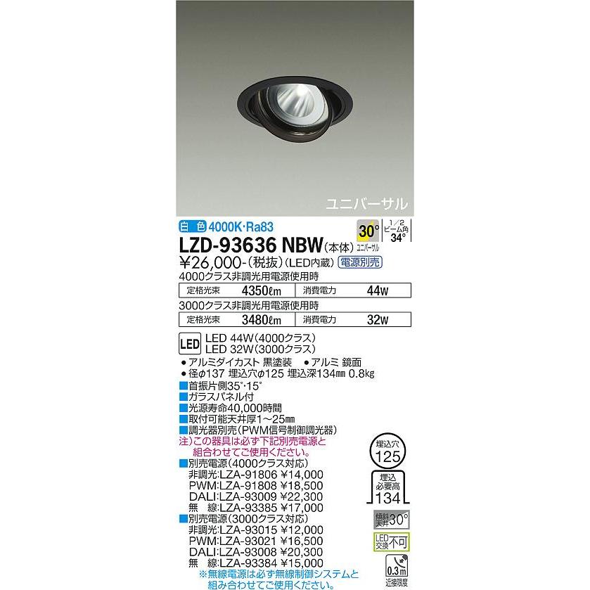 DAIKO 大光電機 LEDユニバーサルダウンライト(電源別売) LZD-93636NBW