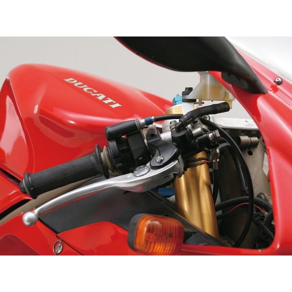 標準ステーの他、ネイキッドモデル装着時にフルードタンクが斜めにならない専用アルミタンクステー(クリアーアルマイト/46852)付属。ストリート用として必要なブレーキスイッチ(平端子2極タイプ)を標準装備。レバーアジャストは6段階調整可能。クランプホルダーはミラー穴無し。ハンドル外径φ22.2専用。ブレーキホース取出方向・角度は横型マスターと同じです。