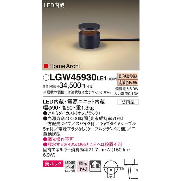 LGW45930 LE1LED内蔵、電源ユニット内蔵白熱電球40形1灯器具相当光源◆LED(高演色・電球色タイプ) ◆色温度:2700 K ◆光源寿命40000時間(光束維持率70%)寸法・質量◆幅:φ90 mm ◆高:90 mm◆質量:1.3 kg仕様◆器具光束:150 lm ◆電圧:100 V ◆消費電力:6.9 W ◆消費効率:21.7 lm/W◆【アルミダイカスト】オフブラック◆据置取付型、美ルック・下方配光タイプ・拡散タイプ・スパイク付◆高演色Ra95◆下方配光タイプ◆スパイク付◆キャブタイヤケーブル5m付◆電源プラグなし(ケーブルグランド同梱)◆二重絶縁型◆入力電流(100V時):0.13 A◆調光操作◆冠水するおそれのあるところへは設置