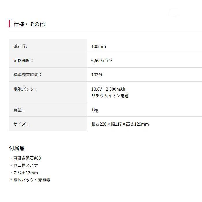 京セラパワー 10.8V 充電式刃研ぎグラインダー BCG-1110L2 ●10.8V-2.5Ahバッテリ・充電器付●乾式砥石で手軽な刃研ぎ●握りやすく操作性の良いコンパクトボディ●小型・軽量●メーカー保証「6ヶ月」付 取扱説明書内の保証書内容をご確認ください。●仕様・その他砥石径:100mm定格速度:6,500min-1標準充電時間:102分電池パック:10.8V 2,500mAhリチウムイオン電池質量:1kgサイズ:長さ230×幅117×高さ129mm付属品・刃研ぎ砥石#60・カニ目スパナ・スパナ12mm・電池パック・充電器京セラインダストリアルツールズ(KYOCERA)旧リョービ(RYOBI)ディスクグラインダーコードレス電動工具 DIY