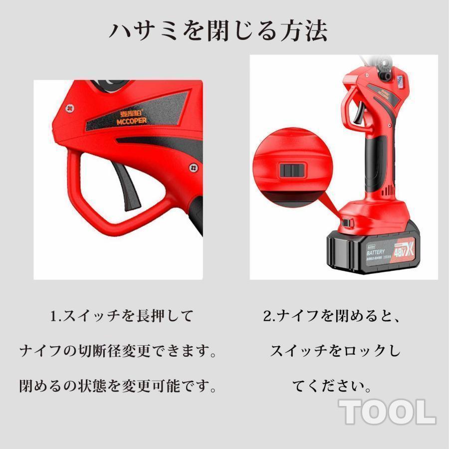 40mm切断径&LCDディスプレイ搭載】剪定バサミは最大切断径40mmの枝切りをパワフルにこなします。業界で一番大きな切断径です。引き金を引くだけで枝木がスパスパ切れます。LCDディスプレイに切断回数とバッテリー残量を表示します。指保護プレート付き、指を傷から保護します。【SK5ブレード&ナイフサイズ変換可能】このコードレス剪定鋏はSK5高炭素鋼から鍛造され、湾曲したデザインと組み合わせることで、木の枝を滑らかできれいに切断できます。ナイフサイズは60mmと25mmという2つモードがあり、最初作動の場合には40mmの大きい剪定径、作動スイッチを押して、ナイフサイズを簡単に切替可能です。【広い適用範囲&安心保証】:プロのコードレス剪定ばさみは、庭、公園、農場、高速道路、大牧草地、造園、果樹園、温室などで広く使用されており、ブドウの刈り取り、花の剪定、桜、リンゴの木の枝などに役立ちます。また、本製品は1年間保証しております。本製品はご購入日から12ヶ月間の保証が付いています。 万が一、初期不良や故障などが発生した場合は、どうぞお気軽にお問い合