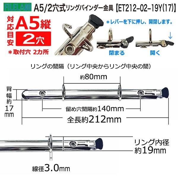 品 名:バインダー金具【ET212-02-19Y(17)】 背なしタイプ 2穴 対応目安:A5縦サイズ:本体長さ 212mm :全長 212mm :背幅 17mm :リング内径19mmバインダー金具の厚さ(取り付け穴の厚さ):約10mm取り付け穴の間隔(穴の中心から中心まで):約140mm材 質:鉄表面処理:ニッケルメッキ止め穴数:2ケ詳 細:20本入り1袋*ご注意*この金具を取り付けるためには、別売の金具が必要です。"} 品 名:バインダー金具【ET212-02-19Y(17)】