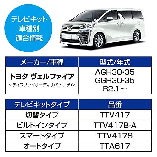 オートタイプ・ TTA617・・Style:オートタイプ・走行中は映像が映らない純正ナビ。このテレビキットシリーズがあれば、走行中でもテレビ/DVDが楽しめます。・切替スイッチがないため取付けがシンプルで、室内のイメージを損なわず装着できます。・適合車種:《トヨタ》アルファード(型式:AGH30・35/GGH30・35)/アルファードハイブリッド(AYH30) ディスプレイオーディオ(9インチ) 年式:R2.1〜・適合車種:《トヨタ》ヴェルファイア(AGH30・35/GGH30・35)/ヴェルファイアハイブリッド(AYH30) ディスプレイオーディオ(9インチ) 年式:R2.1〜 (2020年9月時点)・装着する車種またはナビの機種により、製品の適合品番が異なります。詳しい適合はデータシステムのホームページをご参照ください。"}