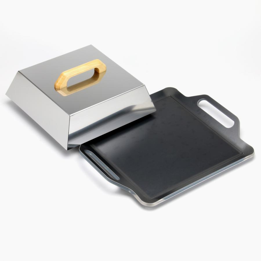 蒸し焼き蓋を使うことで分厚いステーキや骨付きカルビなどにもしっかり熱を入れることができ、調理の幅も広がります。蓋を使うことで調理時間の短縮にもなりますので、ガス代も節約できます。素材はステンレス、取っ手は高温になりにくい木製仕様となります。角部は溶接を行っておりませんが、突合せで隙間なく角部を合わせておりますので、十分に蒸し焼きができる仕上がりとなっております。極厚バーベキュー鉄板と蓋がセットになってお値打ちに価格になっております。