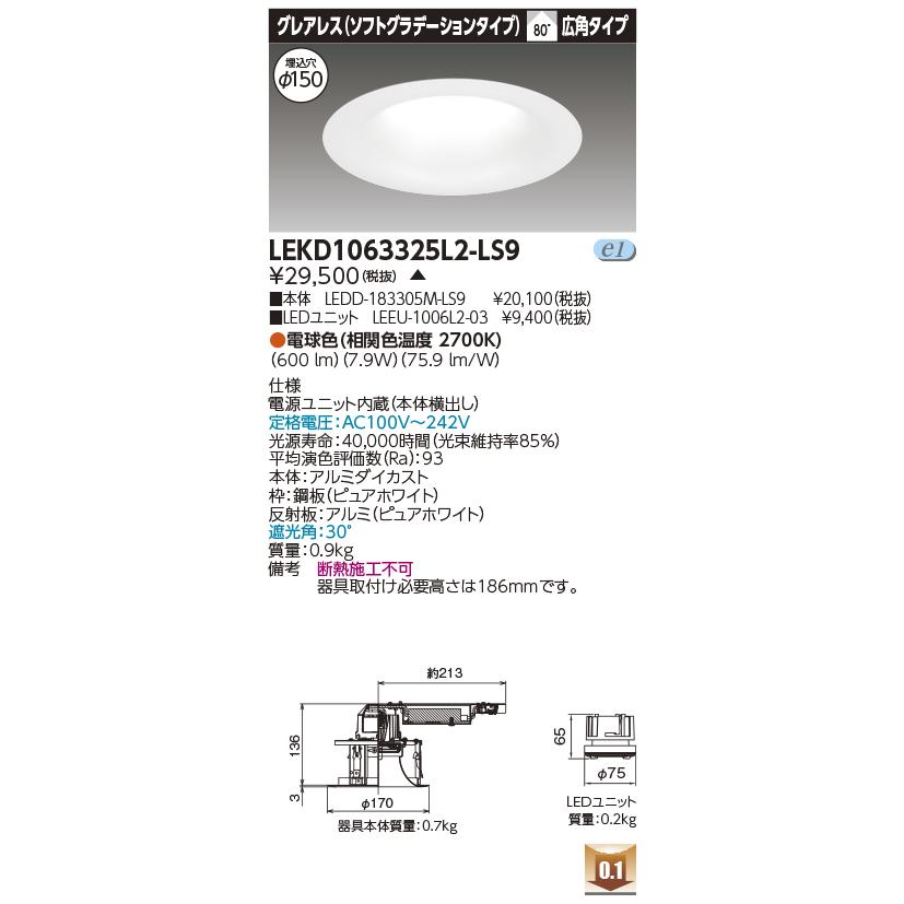 【法人様限定】東芝 LEKD1063325L2-LS9 LEDダウンライト ユニット交換形 埋込穴φ150 広角 グレアレス(拡散カバー)電球色 2700K【受注品】