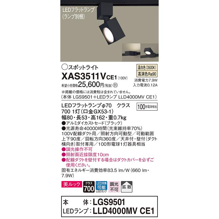 【同一ストア内で税別15000円以上ご購入で送料無料(沖縄・離島など一部地域は除く) 】 住宅用照明器具 パナソニック スポットライト XAS3511VCE1 検索用カテゴリ8 【LED照明】 【プラグタイプ】 【美ルック】 【温白色】 【拡散タイプ】 【非調光】ランプ別梱包