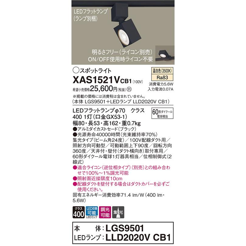 【同一ストア内で税別15000円以上ご購入で送料無料(沖縄・離島など一部地域は除く) 】 住宅用照明器具 パナソニック スポットライト XAS1521VCB1 検索用カテゴリ8 【LED照明】 【プラグタイプ】 【温白色】 【集光タイプ】 【調光可】ランプ別梱包