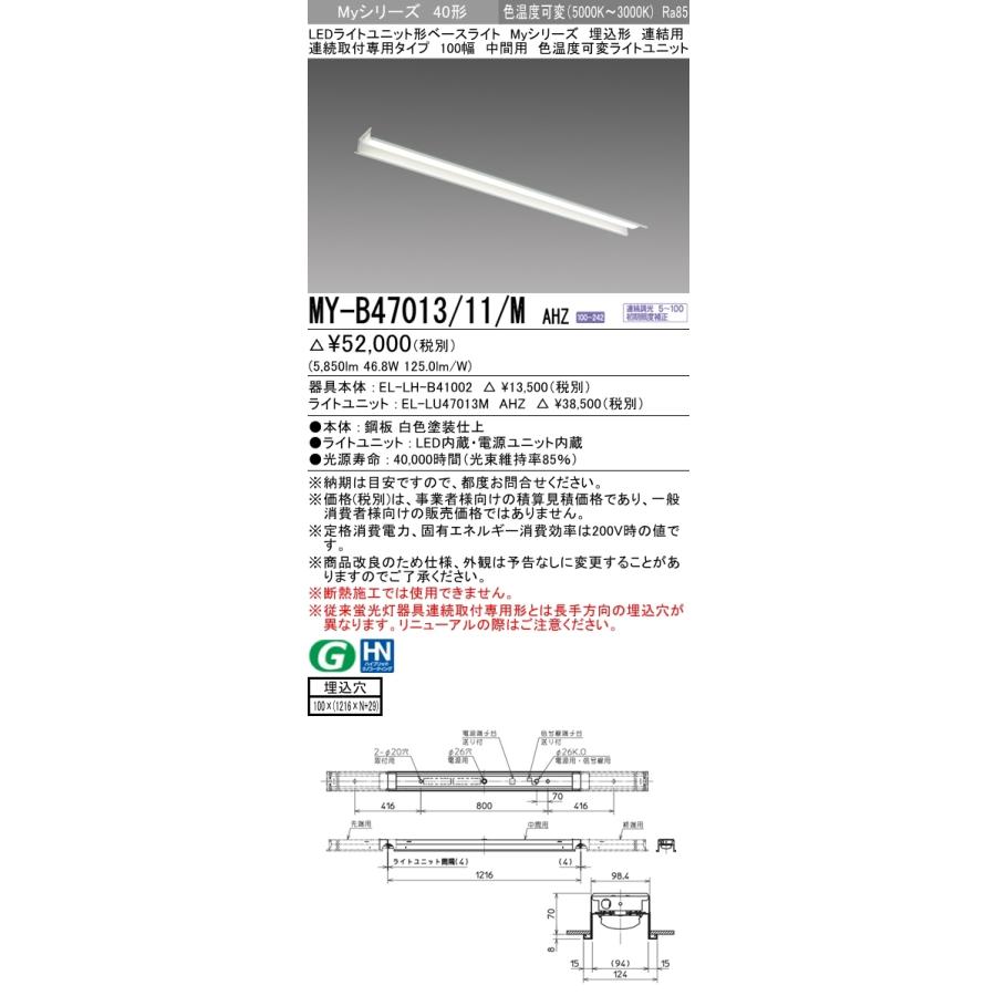 三菱 MY-B47013/11/M AHZ LEDベースライト 埋込形 40形 6900lmタイプ 色温度可変 連結用 100幅 中間用 器具+ライトユニット