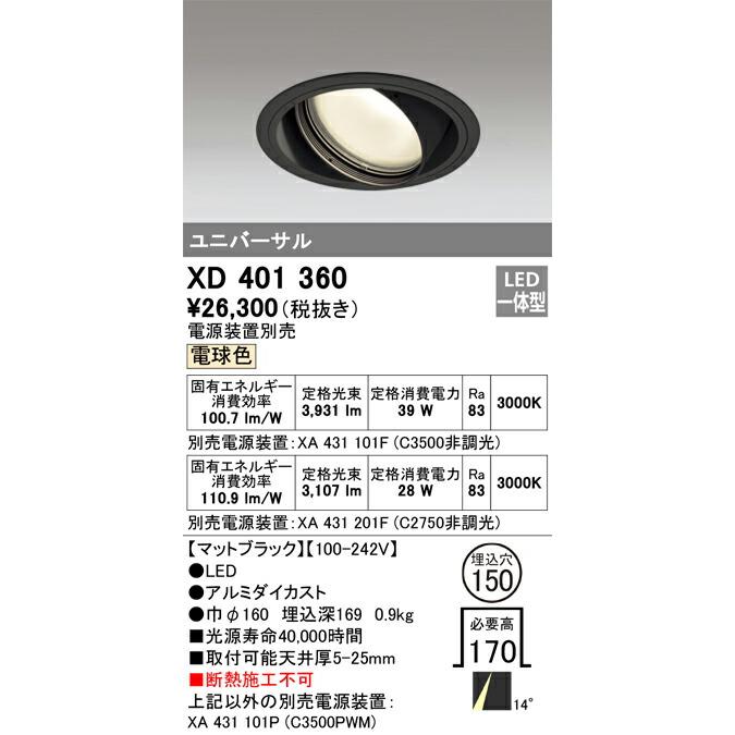 ODELICオーデリックLEDユニバーサルダウンライト(電源別売)XD401360