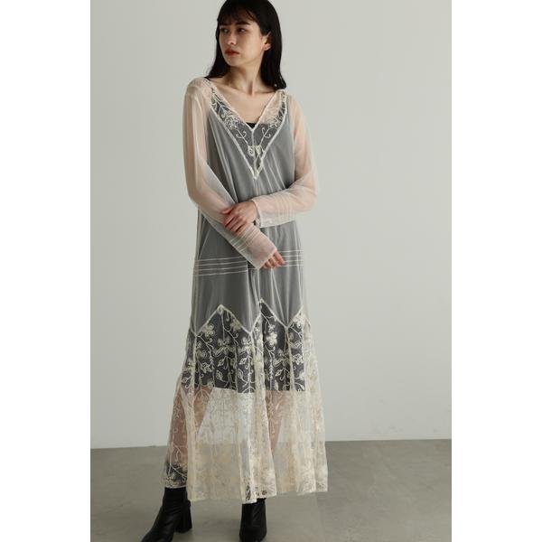 ヴィンテージドレスから着想を得たJILL STUARTオリジナルの刺しゅうレースをあしらったワンピース華奢なチュールにオリジナル刺しゅうレースを組み合わせた、クチュール感あふれるデザインです。裾幅をだすように切り替えを入れ、歩くと上品に揺れるニュアンスある足元が魅力。付属のインナーキャミソールを配色にすることで、繊細な柄を際立たせました。一枚着からインナーを変えて透け感のコントラストを楽しむことも可能。レジャージャケットなどを羽織り、素材の違いを引き立てたコーディネートもイチオシです。