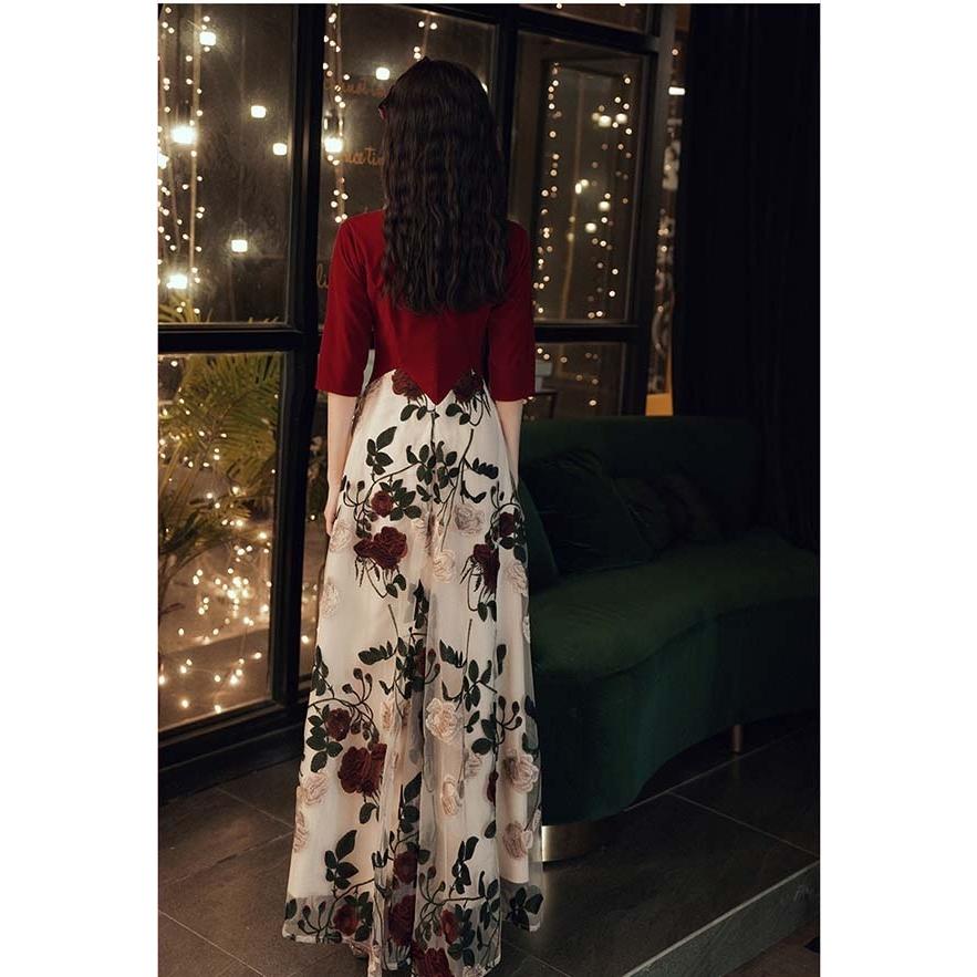 ドレス 花柄 刺繍 vネック 袖あり イブニングドレス ピアノ発表会 パーティードレス 小さいサイズ 女子会 韓国風 ワインレッド