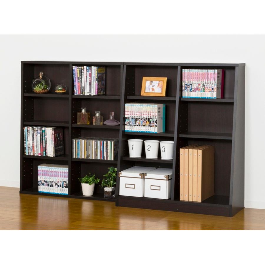 仕様・商品コード:12135・上代:24,200 円(税込) / 22,000 円(税抜)・JAN:4954877121350・色・柄:ダークブラウン・仕様:組立式・商品サイズ:W75×D29.5(17)×H180cm・商品重量:約27.5kg・梱包サイズ:約92×40.5×20.5cm(3辺計約153cm)・梱包重量:約29kg・材質:プリント紙化粧繊維板・商品詳細サイズ:●可動棚 小10枚・中4枚・大2枚●上段内寸=約W35×D15×H87cm(2ヶ所)●下段内寸=約W35×D27.5(15)×H81cm(2ヶ所)・原産個:マレーシア・説明文:奥行が浅い上段はCDやDVD、文庫本などの収納に、奥行の深い下段は百科事典などを収納できます。棚板はすべて可動、収納物の高さに合わせて設置できるので、ムダがありません。下部は斜めにカットされているので安定感があり、また上段・下段が独立しているので、別々にお使いいただくこともできます。背面化粧仕上げ仕様