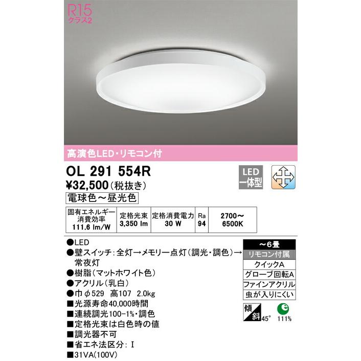 ‡‡‡βオーデリック/ODELIC【OL291554R】シーリングライト 高演色LED 調光・調色 LED一体型 〜6畳 マットホワイト リモコン付属