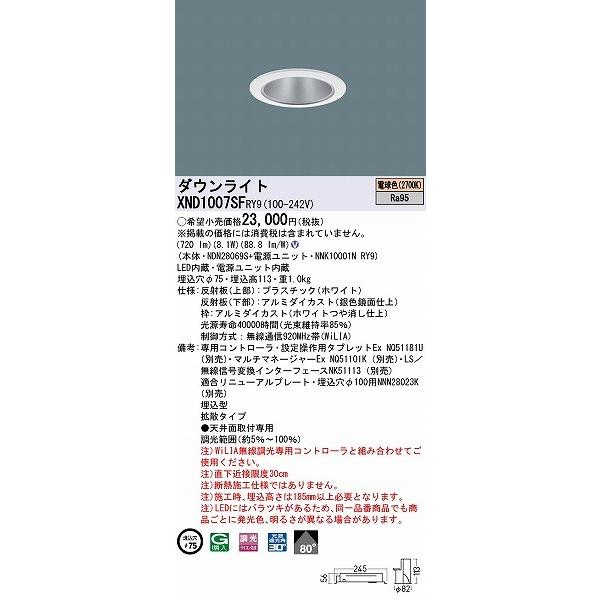 ■返品区分:「返品」お客様都合による返品・交換は受付いたしません。仕様等はご注文前に必ずご確認ください。■送料区分:「送料区分A」※画像はイメージです。商品の詳しい仕様はメーカー受付窓口/HPにてご確認ください。※掲載商品は予告無く販売終了となっている場合もあり、掲載商品全ての出荷確約をするものではありません。パナソニック XND1007SFRY9 LED 電球色 WiLIA無線調光 NDN28069S + NNK10001NRY9 20220124 家具、インテリア 照明器具 天井照明、シーリングライト ダウンライト 照明器具 施設用照明器具 ダウンライト LED WiLIA無線調光XND1007SFRY9 商品説明