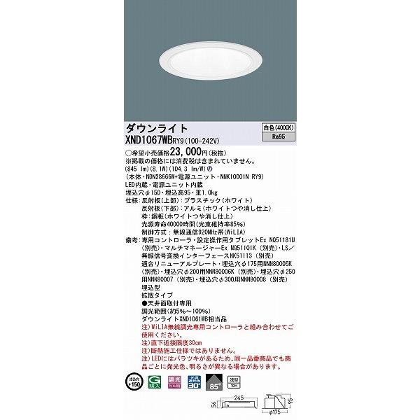 ■返品区分:「返品」お客様都合による返品・交換は受付いたしません。仕様等はご注文前に必ずご確認ください。■送料区分:「送料区分A」※画像はイメージです。商品の詳しい仕様はメーカー受付窓口/HPにてご確認ください。※掲載商品は予告無く販売終了となっている場合もあり、掲載商品全ての出荷確約をするものではありません。パナソニック XND1067WBRY9 XND1061WB 相当品 LED 白色 WiLIA無線調光 NDN28666W + NNK10001NRY9 20220124 家具、インテリア 照明器具 天井照明、シーリングライト ダウンライト 照明器具 施設用照明器具 ダウンライト LED WiLIA無線調光XND1067WBRY9 商品説明