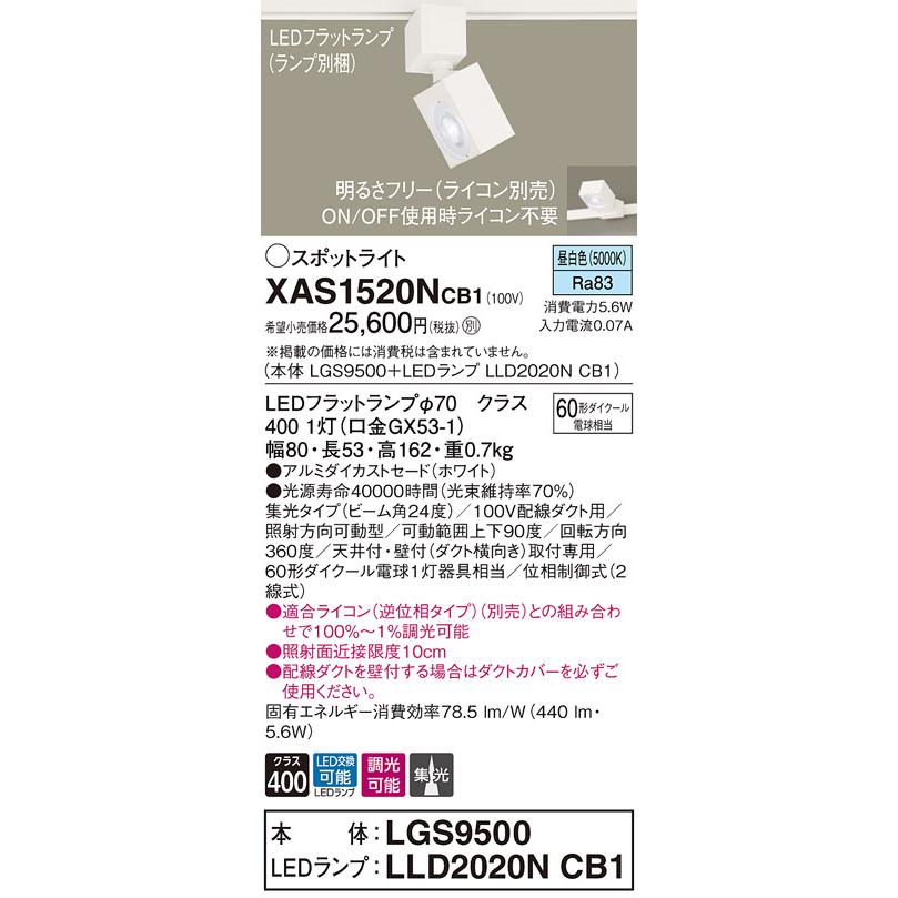 【同一ストア内で税別15000円以上ご購入で送料無料(沖縄・離島など一部地域は除く) 】 住宅用照明器具 パナソニック スポットライト XAS1520NCB1 検索用カテゴリ8 【LED照明】 【プラグタイプ】 【昼白色】 【集光タイプ】 【調光可】ランプ別梱包
