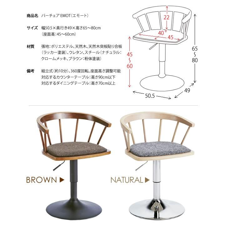 ![]() 低めの座面高でダイニングにもカウンターにも使える便利な北欧風バーチェア『EMOT(エモート)』。 木目の美しい天然木突板の曲げ木と、ファブリックの張地でオシャレな雰囲気を演出。360度回転&レバー式昇降、身体にフィットする丸い背もたれ付きで、長時間のお喋りや朝食などお食事も快適。 カラーはナチュラル、ブラウンの2カラーをご用意。張地や木材、脚部のカラーがそれぞれ異なります。お部屋の雰囲気やお好みでお選びください。 | ![]() |