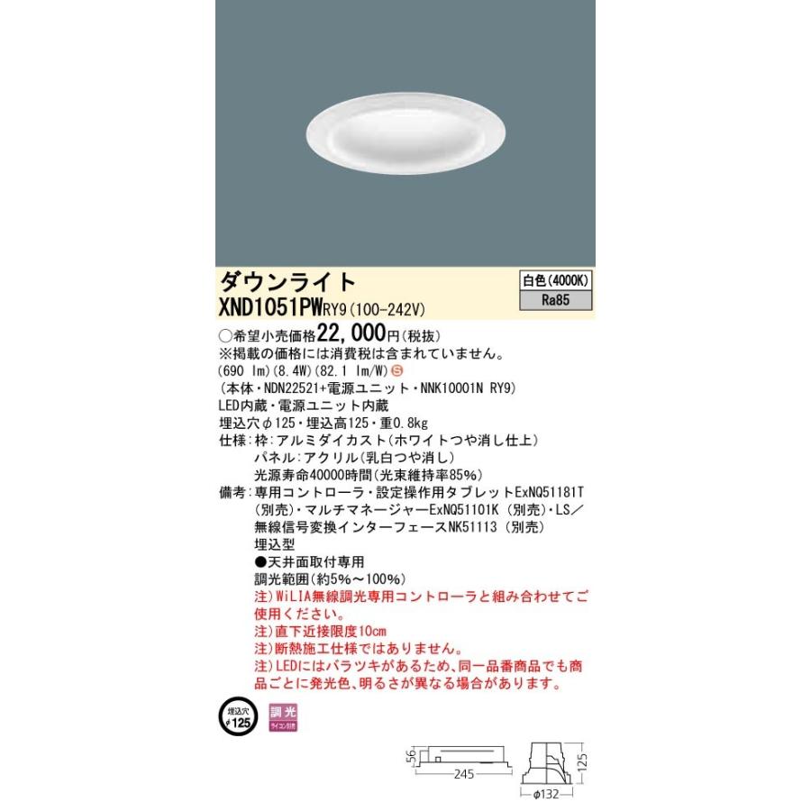 【法人様限定】パナソニック XND1051PWRY9 LEDダウンライト 埋込穴φ125 白色 調光【NDN22521 + NNK10001N RY9】