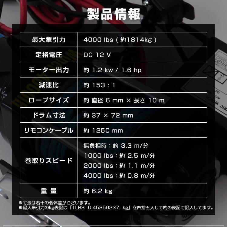 最大牽引力1814kg!小型でも強力パワー!ジェットスキー、ボートや重量物を引き上げる際にとても便利な電動ウインチです。カー電源対応!車のDC12Vバッテリーに繋げて使用します。半永久的使用可能なマグネット式モーターを採用。積荷が傷つきにくいロープタイプです。【仕様】巻き上げ重量:4000LBS(1814kg)定格電圧:DC12Vギア比(減速比):153:1モーター出力:(約)1.2kw / 1.6hpロープサイズ:(約)直径6mm×長さ10mドラム寸法:(約)37mm×72mmリモコンケーブル:(約)1250mm重量:(約)6.2kg防水仕様【巻取りスピード】無負担時:(約)3.3m/分1000lbs:(約)2.5m/分2000lbs:(約)1.1m/分4000lbs:(約)0.8m/分【内容】電動ウィンチ本体 ×1コントロールBOX ×1有線リモコン ×1フェアリード ×1フック ×1フックストラップ ×1取り付けネジ一式無線リモコン ×1英語簡易取扱説明書 ×1(電動ウインチ 12V 電動 ウインチ オフロード車 トラック SUV車 Zeep FJクルーザー DC12V 車 カー 電源 電動 ホイスト 電動ウィンチ 引き上げ機 牽引 けん引 激安 最安値)