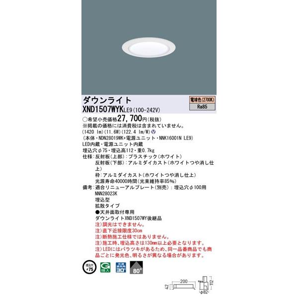 パナソニック ダウンライト ホワイトコーン φ75 LED(電球色) 拡散 XND1507WYKLE9