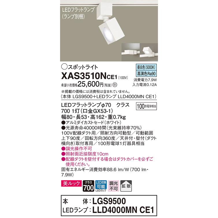 XAS3510NCE1 LEDスポットライト 天井付・壁付 配線ダクト取付型 昼白色 美ルック 拡散タイプ 調光 白熱電球100形1灯器具相当 Panasonic