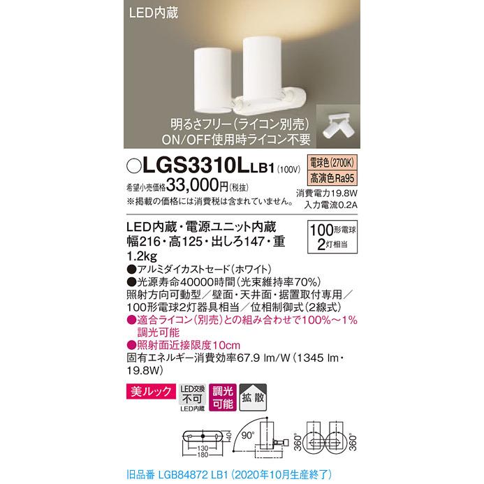 LGS3310L LB1LED内蔵、電源ユニット内蔵光源◆LED(電球色タイプ) ◆色温度:2700 K ◆光源寿命40000時間(光束維持率70%)寸法・質量◆幅:216 mm ◆高:125 mm ◆出しろ:147 mm◆質量:1.2 kg仕様◆器具光束:1345 lm ◆電圧:100 V ◆消費電力:19.8 W ◆消費効率:67.9 lm/W◆【アルミダイカストセード】ホワイト◆天井直付型・壁直付型・据置取付型◆高演色Ra95◆照射方向可動型◆可動範囲上下90度◆回転方向180度◆壁面・天井面・据置取付専用◆100形電球2灯器具相当◆位相制御式(2線式)◆入力電流(100V時):0.2 A◆適合ライコン(別売)との組み合わせで100%〜1%調光可能◆照射面近接限度10cm