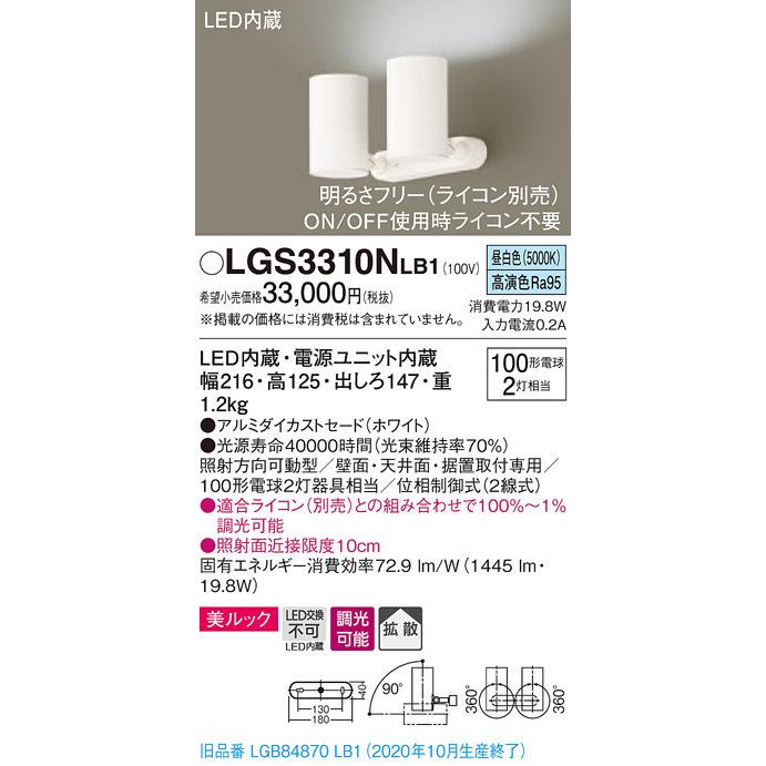 パナソニック LGS3310N LB1 天井・壁直付型・据置取付型 LED 昼白色 スポットライト 美ルック 拡散型 調光型 白熱電球100形2灯相当