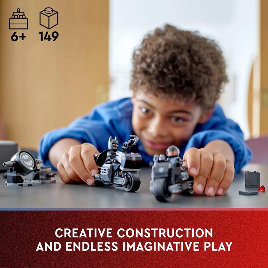 Fast-moving action ? The impressive, dual-motorcycle DC Batman: Batman & Selina Kyle Motorcycle Pursuit (76179) set puts the excitement of The Batman movie into kids’ hands2 minifigures ? Includes Batman, with a fabric cape, and Selina Kyle minifigures, a Batarang, grappling gun, chain, gem element and a glow-in-the-dark BatsignalHands-on fun ? Kids take their imaginations on a thrilling motorcycle ride with Batman and Selina Kyle, enjoying endless super-hero adventures as they goIdeal for kids aged 6 and up ? This versatile playset makes a great gift for Batman fans and any young motorcycle enthusiastPortable play ? With Batman’s motorcycle measuring over 1 in. (4 cm) high, 3 in. (9 cm) long and 1 in. (3 cm) wide, this versatile playset is the perfect size to carry wherever kids want to play