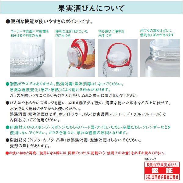 果実酒びん 8リットル 10号 6個 東洋佐々木ガラス (I-71808-R-A-JAN) ●たっぷりサイズ8リットル。●梅酒や果実酒のつくり方がわかるシオリが入っています。■商品詳細・メーカー 東洋佐々木ガラス・シリーズ 果実酒びん・サイズ 口径110×高さ340・最大径205 (mm)・容量 8000ml・材質 本体: ソーダライムガラス(耐熱ガラスではありません) 外ブタ: ポリプロピレン樹脂/耐熱製温度:100℃ 内ブタ: ポリエチレン樹脂(抗菌剤入)/耐熱温度:70℃ 吊手・ハンドル・止め具: ポリプロピレン樹脂/耐熱製温度:90℃ ハンドル・リング: ポリエチレン樹脂/耐熱製温度:40℃・生産国 日本・備考 マシンメイド/日本製 長期保存果実酒びん認証品[ 検索ワード:母の日 父の日 敬老の日 2021 お返し プレゼント 贈り物 ギフト おしゃれ 実用的 誕生日 記念日 お中元 お歳暮 ]