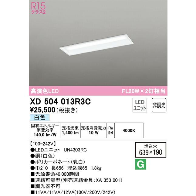 βオーデリック/ODELIC【XD504013R3C】ベースライト埋込型(下面開放型(幅190)) 高演色LED 白色 非調光 LEDユニット型 20形 1600lmタイプ